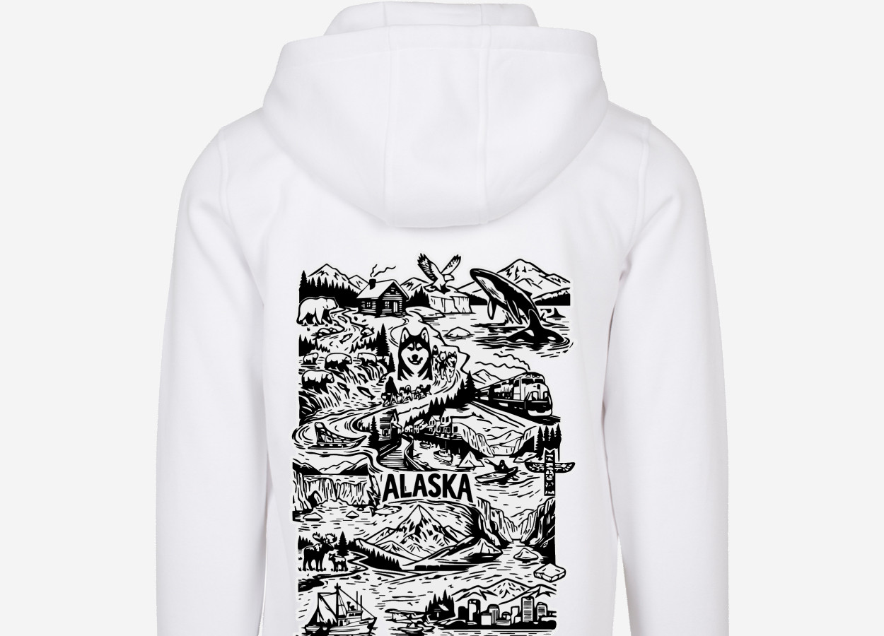 Meet the hoodie built for people who don’t just like Alaska. This heavyweight, adventure‑ready hoodie features a full‑back graphic packed with everything that makes Alaska legendary: sled dogs, reindeer, glacier peaks, rugged ships, bears, icebergs, frontier cabins, totem‑inspired details, gold mining trains, and kayaks slicing through icy water.