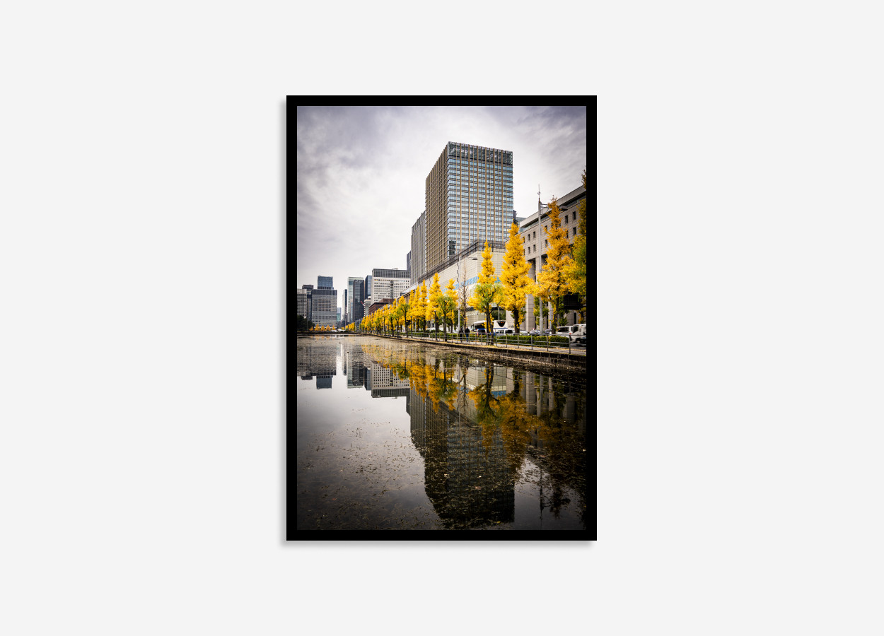 A Tokyo skyline print with mirrored golden-yellow autumnal trees in still water with. A print full of yellow and brown hues and crisp architectural detail. A print full of yellow and brown hues and soft seasonal tones, it blends the energy of a modern cityscape with the peaceful glow of autumn. The reflection creates a sense of balance and symmetry.