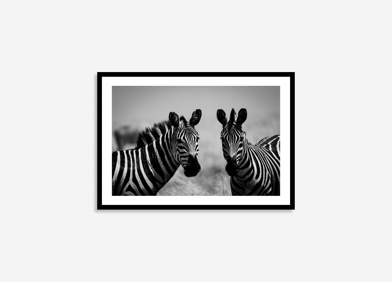 Bring the captivating beauty of the African savannah into your home with this stunning black and white zebra print. Â This striking photograph captures two majestic zebras, their unique stripes dramatically contrasting against the landscape of their native home in Kenya.