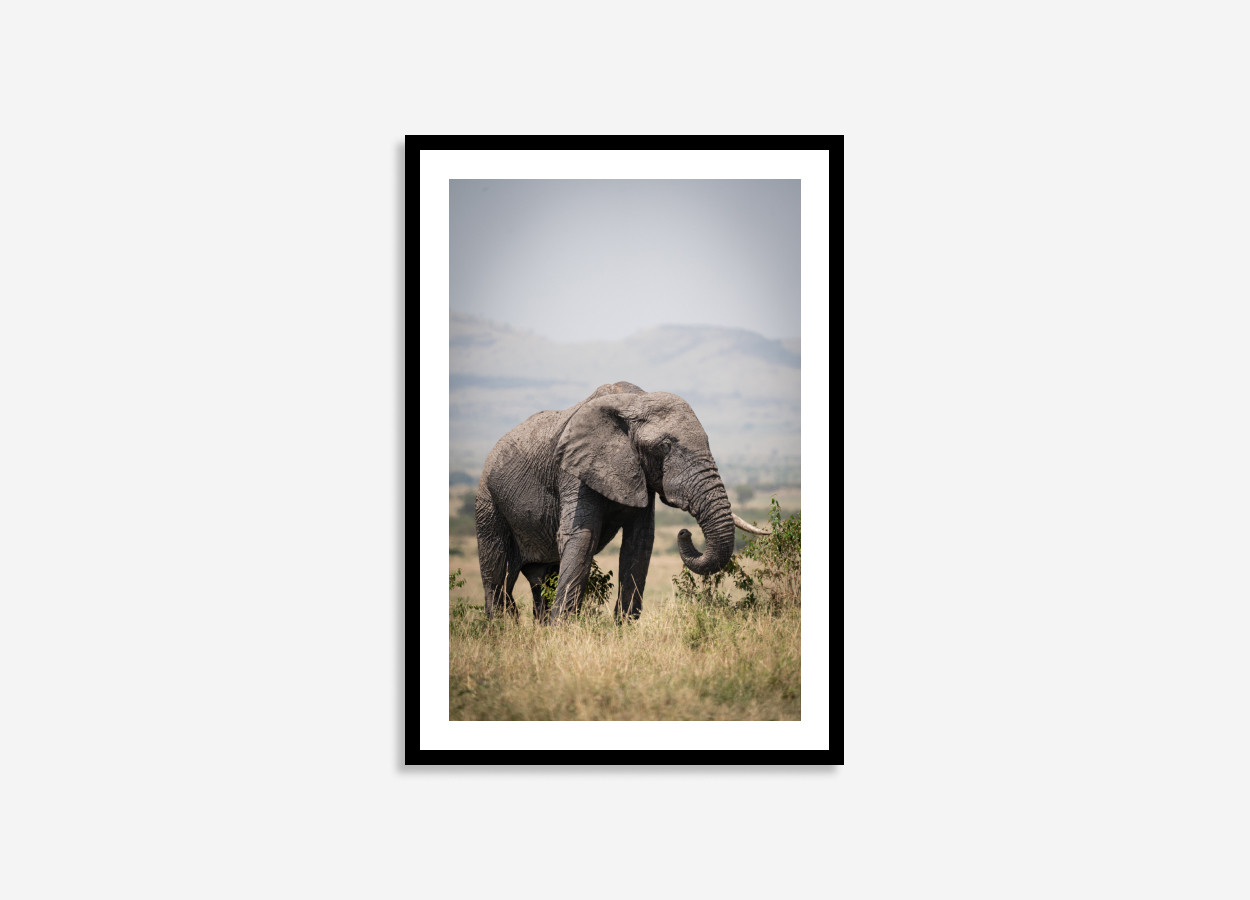 Bring the awe-inspiring presence of the African safari into your home with this magnificent Elephant portrait Print. Captured in the heart of Kenya, this photograph features a majestic, solitary elephant in its natural habitat, set against the backdrop of rolling hills.