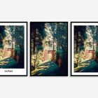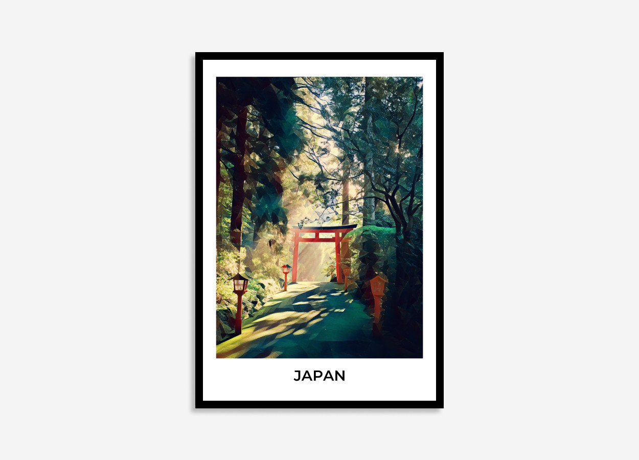 Dive into the rich culture and serene beauty of Japan with this travel art print highlighting the iconic Torii gate and the lush forest surroundings.