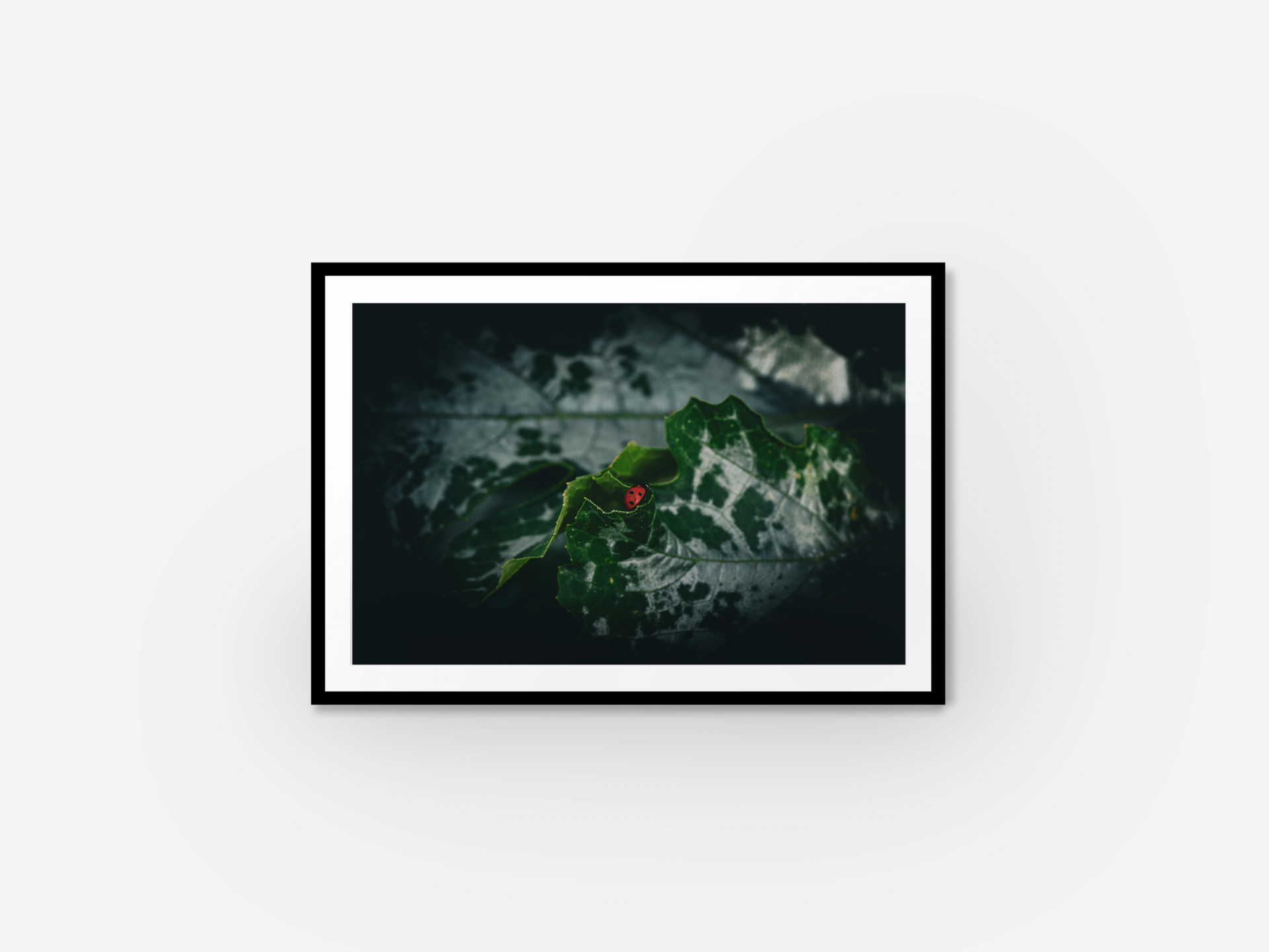 Celebrate the vibrant charm of nature with this exquisite ladybird (or ladybug) wildlife wall art print. Captured in the lush greenery of the United Kingdom, this macro photograph highlights the vivid red of a ladybird delicately resting on rich green leaves. The striking contrast and intricate details of the ladybird’s spots, combined with the textured foliage, create a captivating focal point that brings the outdoors into your home.
