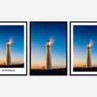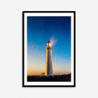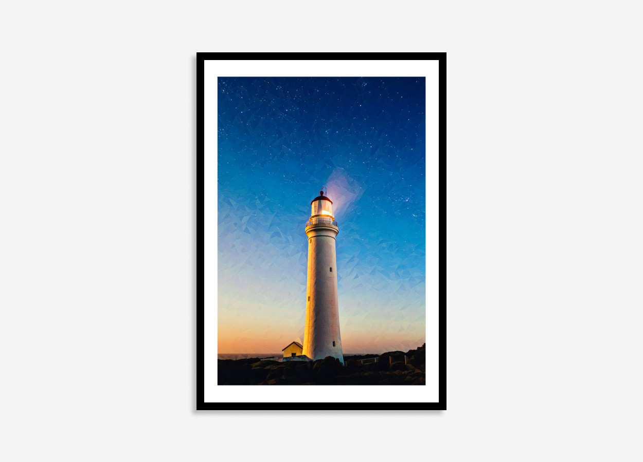 Experience the sheer magic of this geometric illustration print capturing a lighthouse in Australia during a sunrise. A truly captivating portrait print of a star-filled sky.