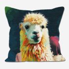 An accent decorative cushion of a llama from Peru, this Peruvian Llama Decorative Pillow features woven-like patterns in soft beige and cream tones, accented by delicate pinks, fresh greens, and rich dark greens.