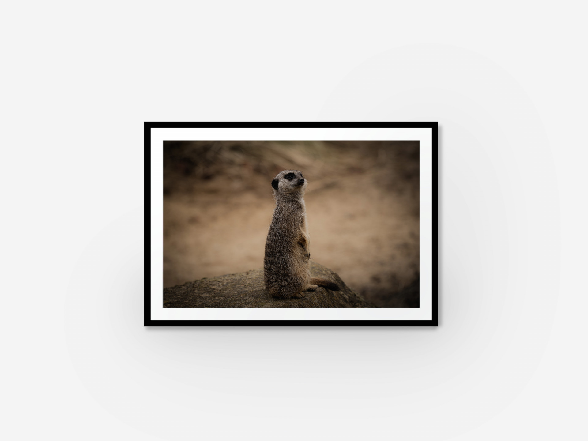 This stunning meerkat wildlife wall art print captures a curious meerkat standing alert against a soft, sandy backdrop, embodying the playful and vigilant nature of these fascinating African animals. Known for their sociable behavior and sharp senses, meerkats often stand guard on elevated perches, scanning the horizon for predators such as birds of prey or jackals. This photograph beautifully showcases the warm tones of the desert sand contrasting with the meerkat’s rich fur, creating a striking and lively focal point for any room.