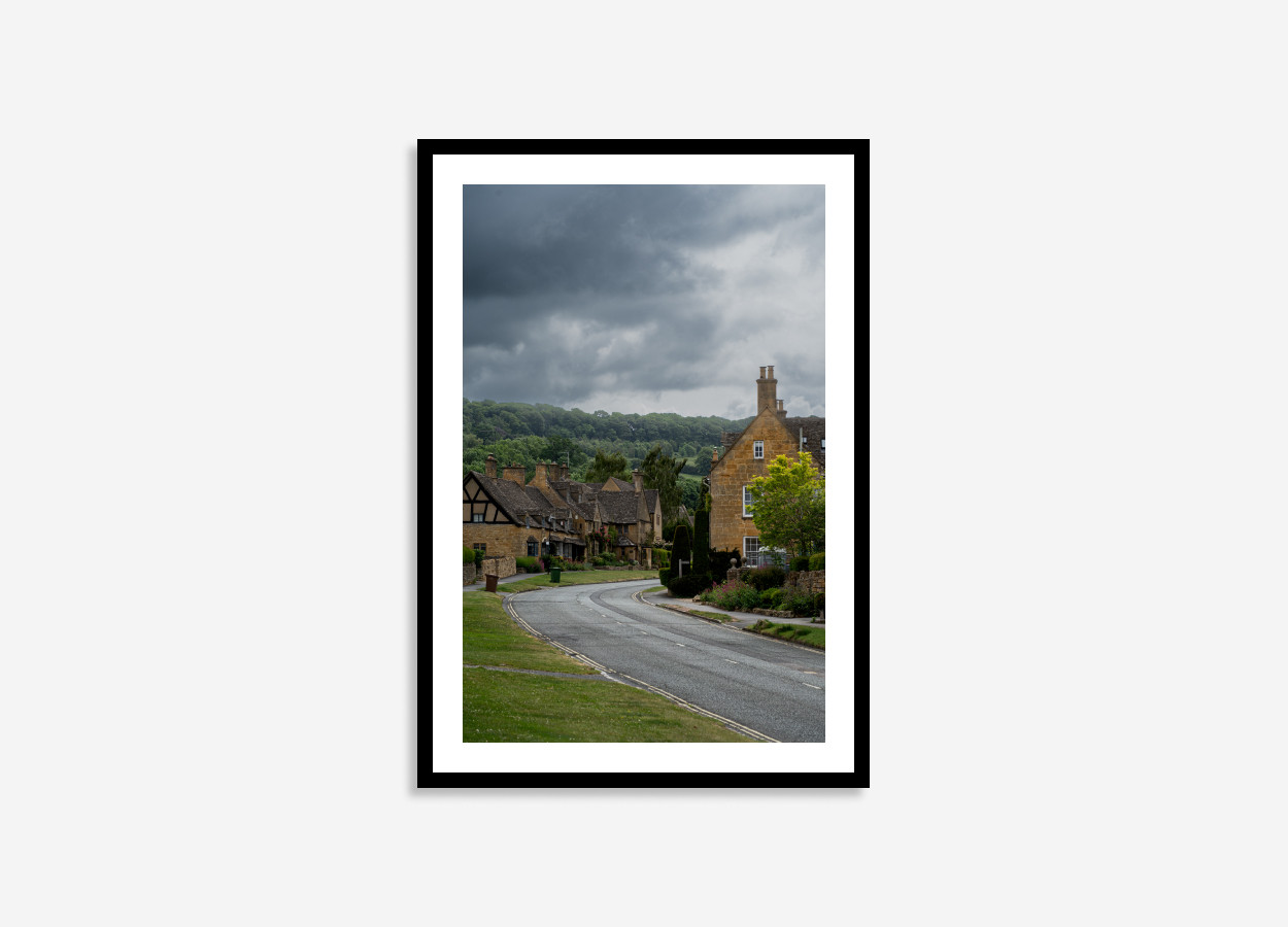 A traditional picturesque English village within the Cotswolds. This photography was captured in the heart of the English countryside, and features a winding road leading through traditional honey-colored stone cottages, lush green trees, and a dramatic moody sky.