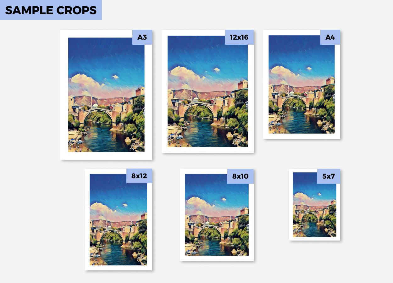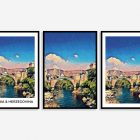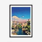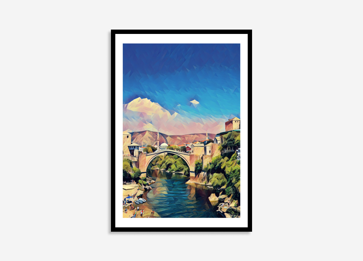 An illustration of the most famous sight in Bosnia & Herzegovina – Mostar. This reconstructed medieval arched bridge (Stari Most) is an iconic bridge spanning across a scenic river. Whether displayed at home or within an office this artwork is sure to create a sense of calm and appreciation for the less visited countries.