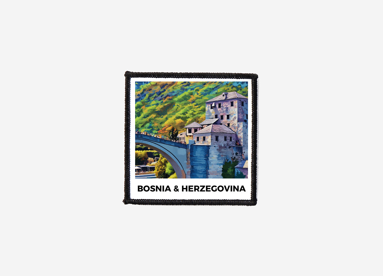 Printed patch of Bosnia and Herzegovina’s most iconic landmarks – the Old Mostar Bridge (Stari Most). Designed for travellers and explorers who want to display their travel memories to Mostar or Bosnia.