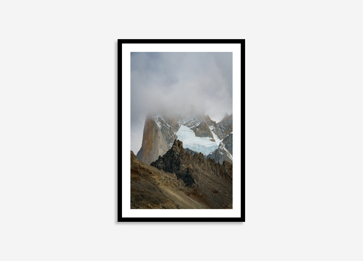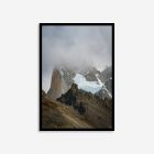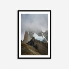 A landscape wall art print from Patagonia, Argentina. This print displays a ruggeded mountain with a snow-capped peak in a mystical swirling fog. The moody clouds and imposing peaks create a powerful, yet calming focal point for any room. The colours of this print have muted earthy tones that create a tranquil and sophisticated atmosphere in home decor by connecting spaces to nature. These versatile colors serve as a neutral backdrop for other design elements within your interior decor, highlight natural materials like wood and stone, and create a peaceful environment in your home.Â