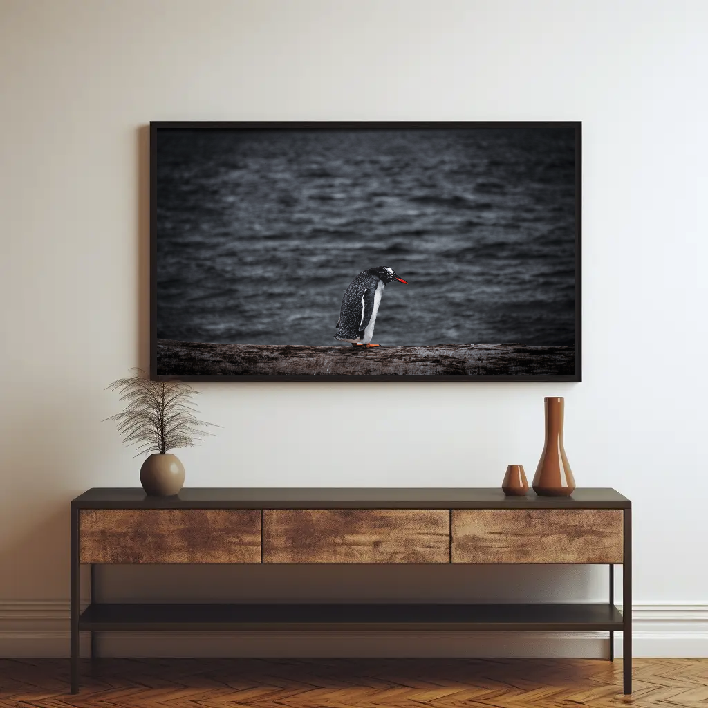Transform your living space with the penguin wildlife wall art from Argentina’s Patagonia. Experience the magic of the great outdoors with this remarkable wildlife photograph capturing a penguin standing on a branch, surveying the expansive ocean view. A scene that brings the wild beauty of Patagonia’s coastlines into your home