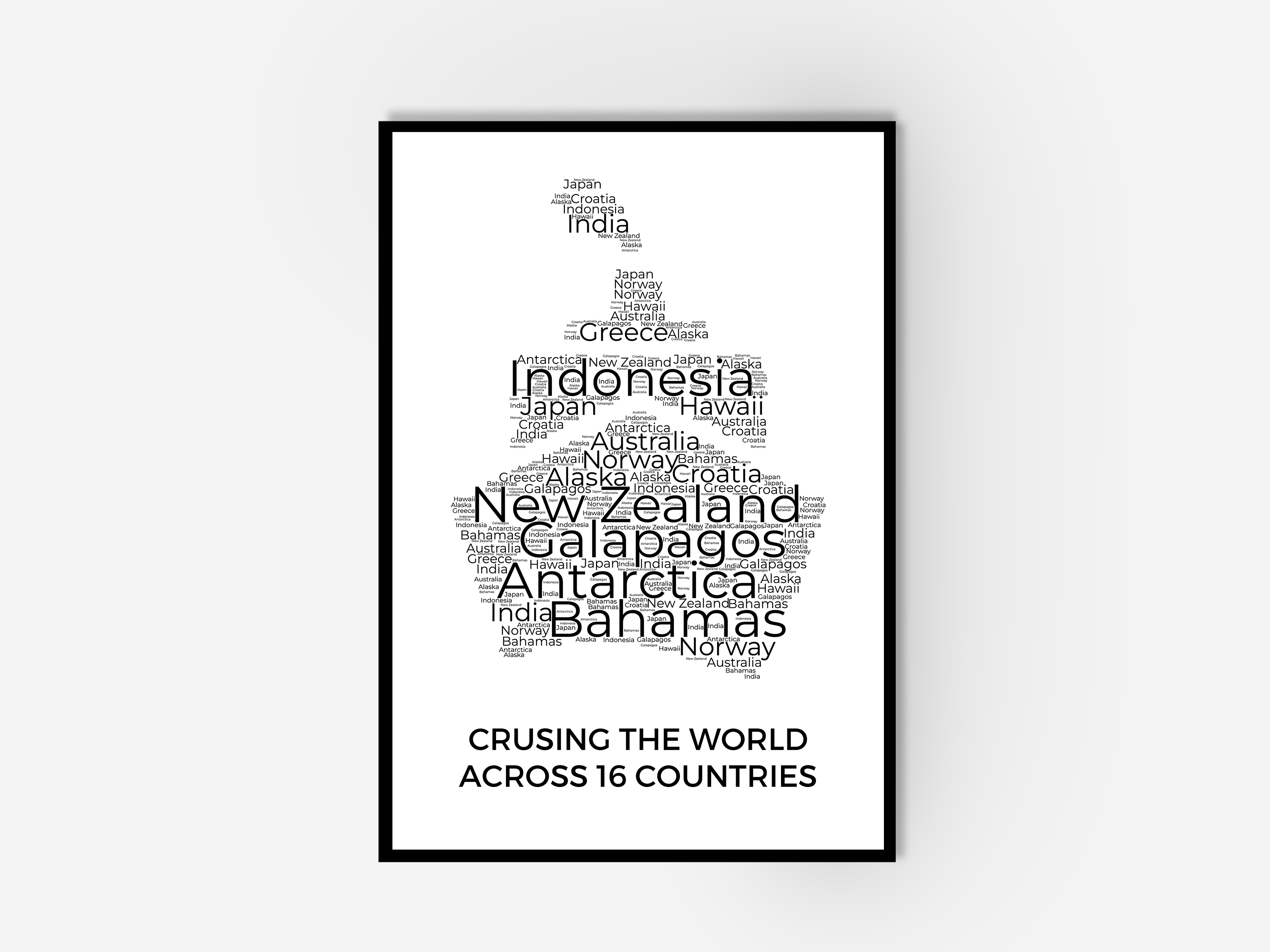 Record the places you docked at, the countries you have explored and the seas you have sailed on with our collage poster. Create a custom keepsake of your past voyages with our personalised cruise wall art. Return home and record you travel story on your walls. Can also make a great bucket list travel poster of the destinations you dream of sailing to.