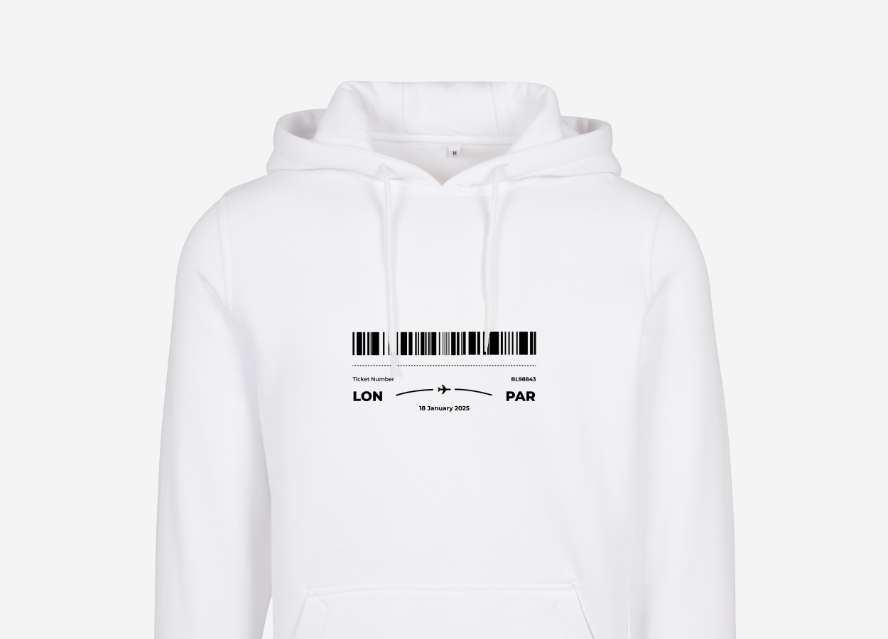 Create a keepsake to remember your holiday with this personalised hoodie. Personalised hoodies are great for school trips, ski trips, sports teams, or as a unique gift for a loved one. Add departure date, departure, and arrival locations (including airport codes) to remember the flight.