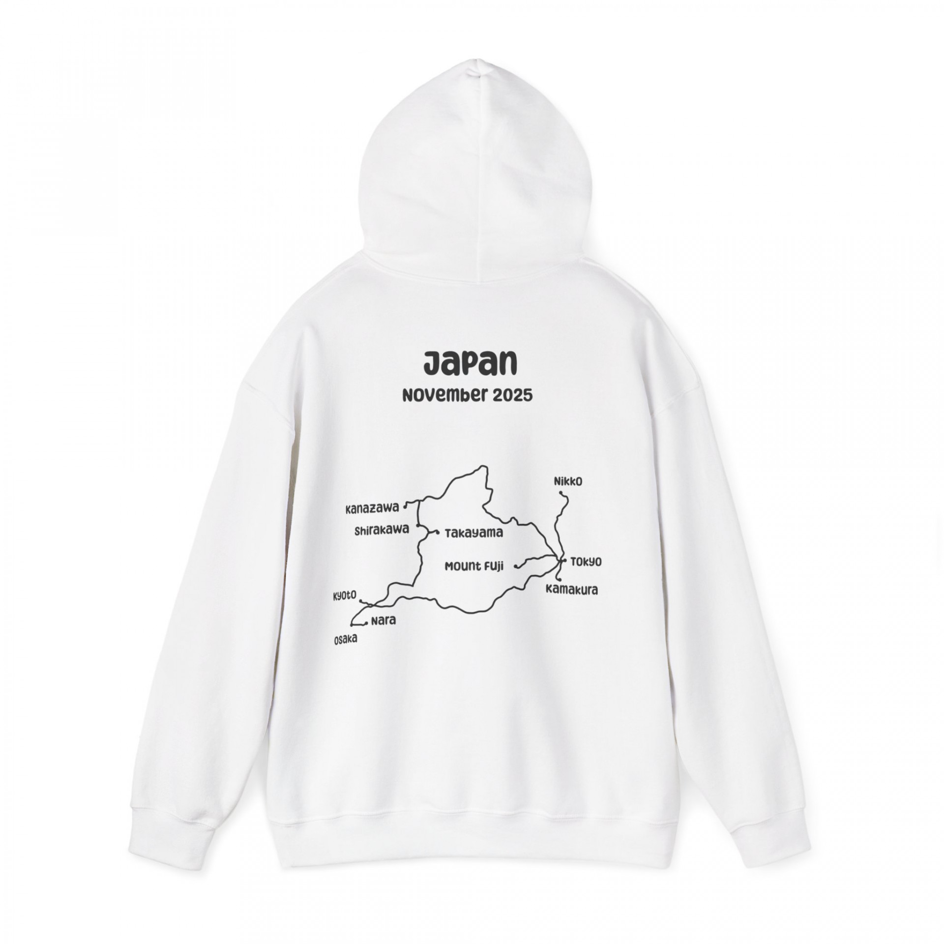 Capture the magic of your Japan adventure with our customised travel route hoodie — a unique way to relive every step of your journey across this vibrant country. Whether you wandered the neon streets of Osaka, soaked in Kyoto’s tranquil temples, trekked through Takayama’s historic trails, or met the friendly deer in Nara, this hand-illustrated map hoodie turns your itinerary into wearable art, so you can keep your favourite memories close to your heart.