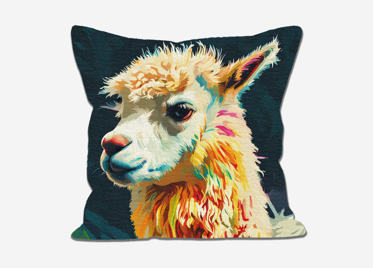 A decorative pillow of Peruvian llama captures the bold colours of the Andes. A wildlife accent cushion that blends traditional animals of the Andes with vibrant colours of South America. This design draws from the traditional decor from around Cusco that echo Altiplano animal art.