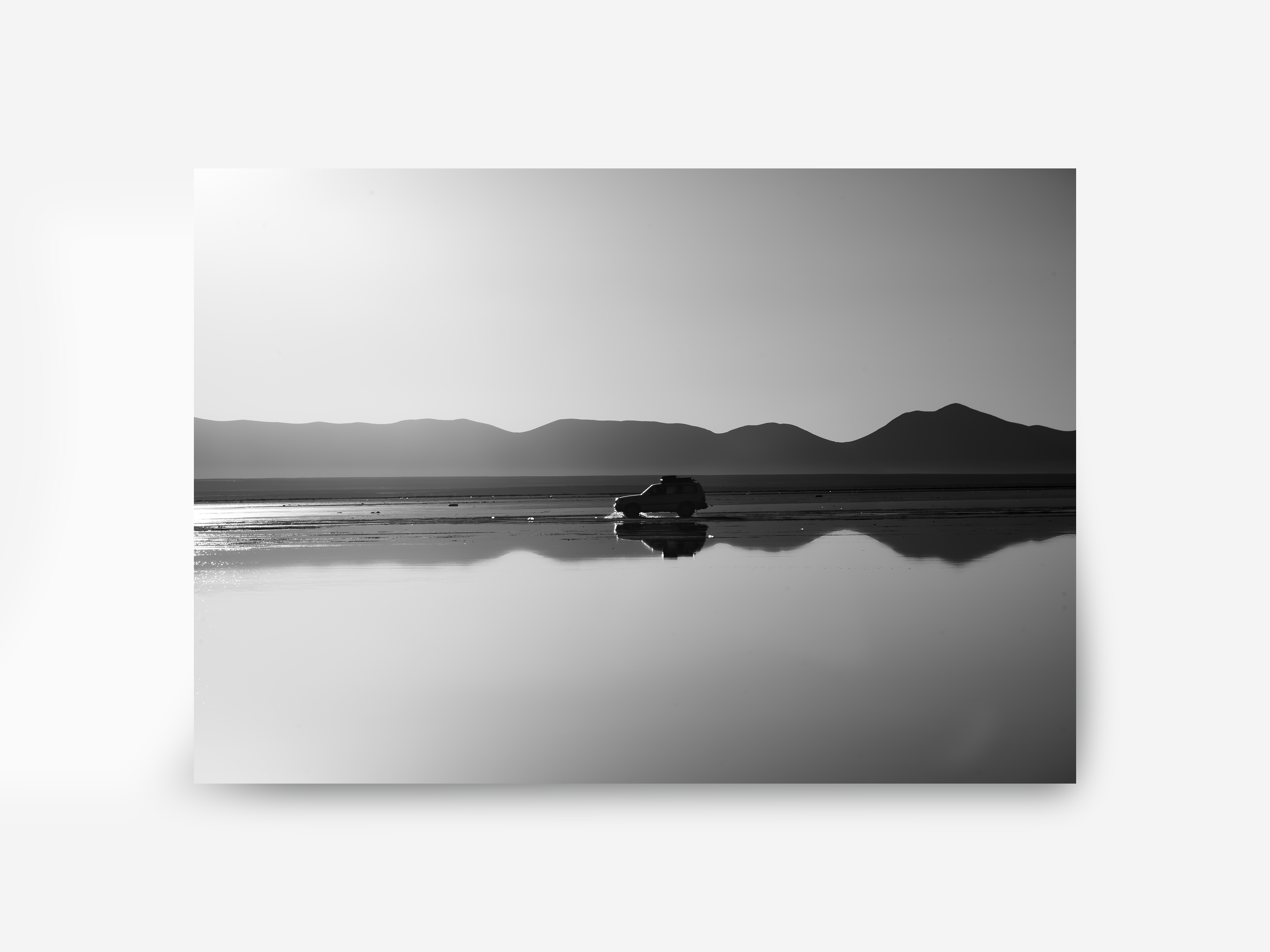 Experience the surreal beauty of Bolivia’s Salar de Uyuni, the world’s largest salt flat, with this captivating black and white landscape photograph. The image showcases the salt flats’ pristine white surface acting as a natural mirror, perfectly reflecting the surrounding rugged mountains and a solitary jeep. This striking contrast between the salt’s brightness and the dark mountain silhouettes creates a harmonious and symmetrical composition that highlights the breathtaking balance of nature.