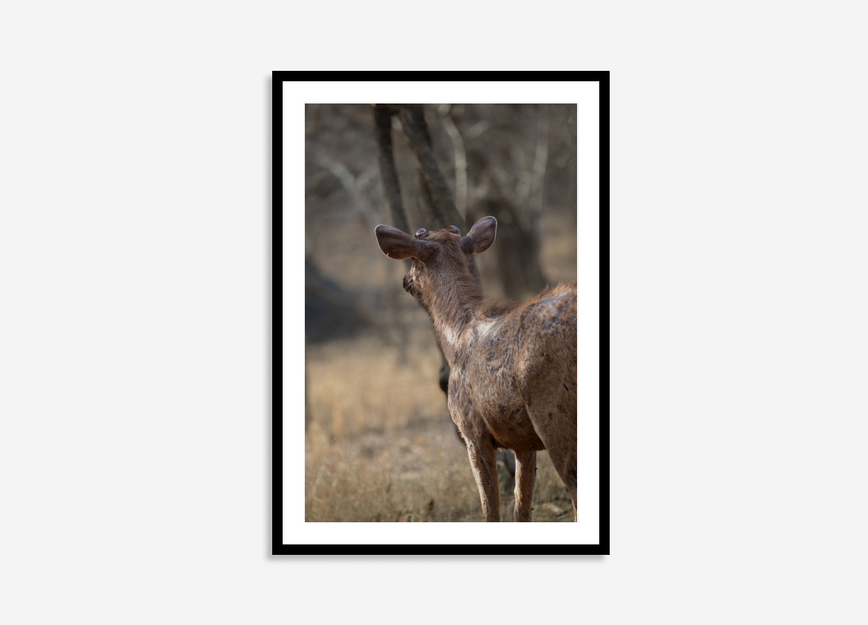 A stunning wildlife wall art piece capturing the tranquil beauty of the Indian deer in its natural habitat at Ranthambore National Park, India. Featuring an Indian deer standing looking into the distance amid the brown forest backdrop of Ranthambore National Park. Ideal wall art for nature and wildlife enthusiasts.