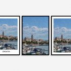 A travel poster of the Adriatic coast with illustrated Split harbour. This wall art captures boats parked in the sea, with historic church towers and old town buildings rising in the background. A perfect keepsake for anyone who has been to Split or anyone who wants to display wall art of iconic European coastal cities full of blue hues.