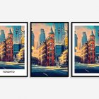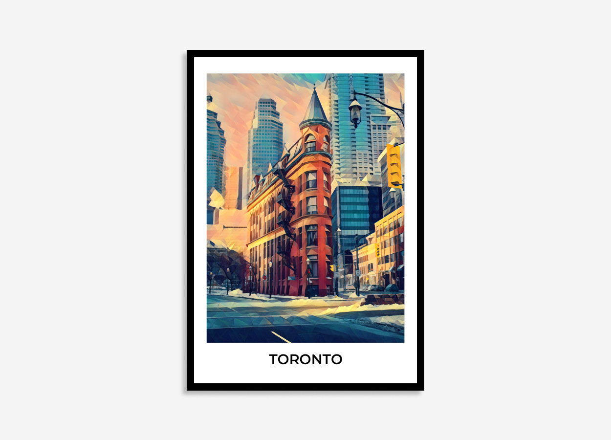 An artistic cityscape illustration of Toronto, Canada. This poly art poster showcases the perfect blend of historic red architecture and modern skyscrapers, capturing the vibrant essence of urban life.