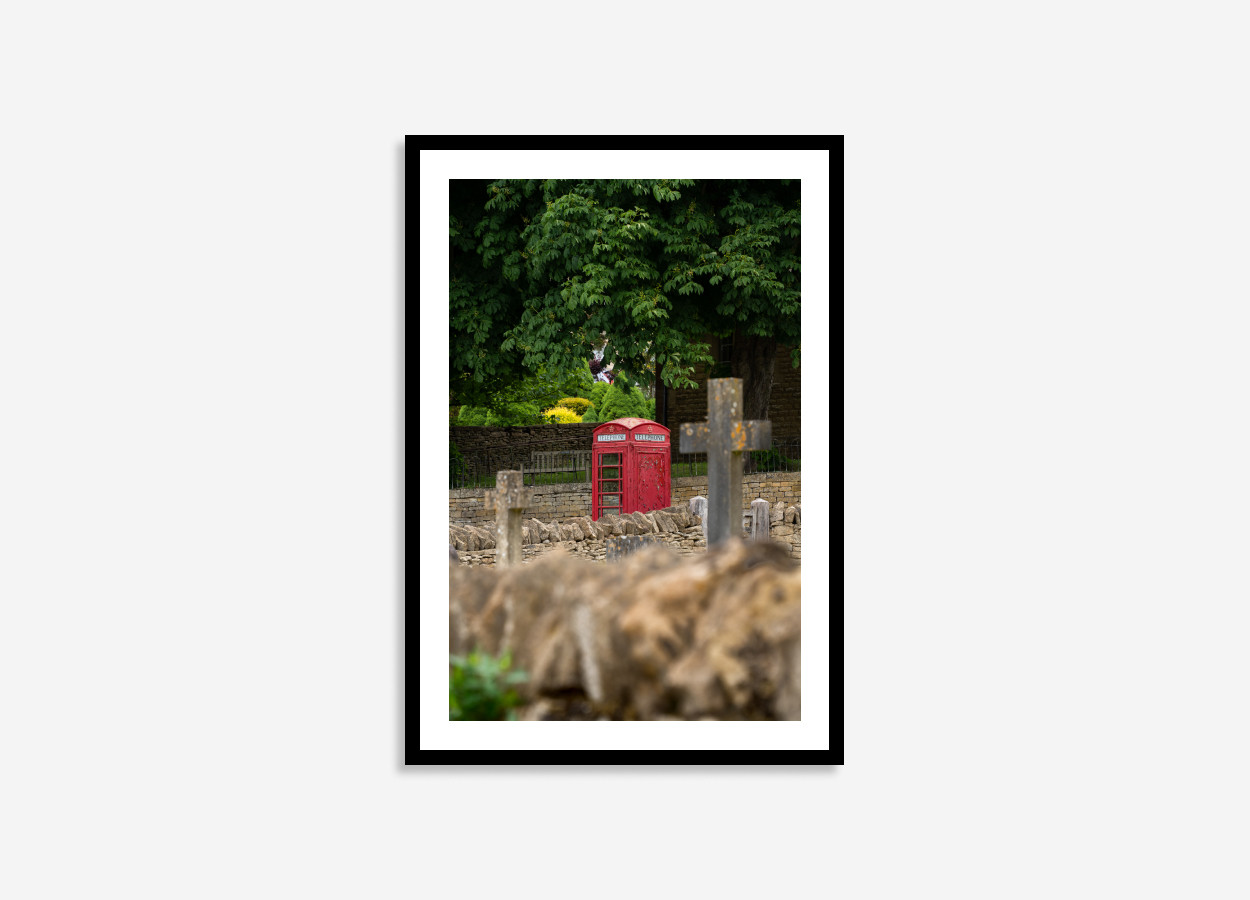 Bring timeless English charm to your home with a Cotswolds village wall art print. Featuring a traditional phone box, among a tranquil village graveyard, and a weathered Christian stone cross. Nestled in the heart of a historic Cotswolds village, this high-resolution photograph blends heritage, faith, and rural beauty in one captivating composition.