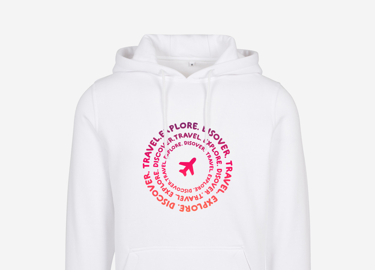 The Travel. Explore. Discover. hoodie. Featuring a bold and playful design, this piece bursts with colour— showcasing pink, purple, and orange text around an airplane motif on a crisp white hoodie. The vibrant colors create a cheerful, eye‑catching look that brightens any outfit, perfect for adding a touch of adventure to your everyday style. Soft, cozy, and full of meaning, it’s an ideal gift for travel lovers, globe‑trotters, or friends embarking on a new chapter.
