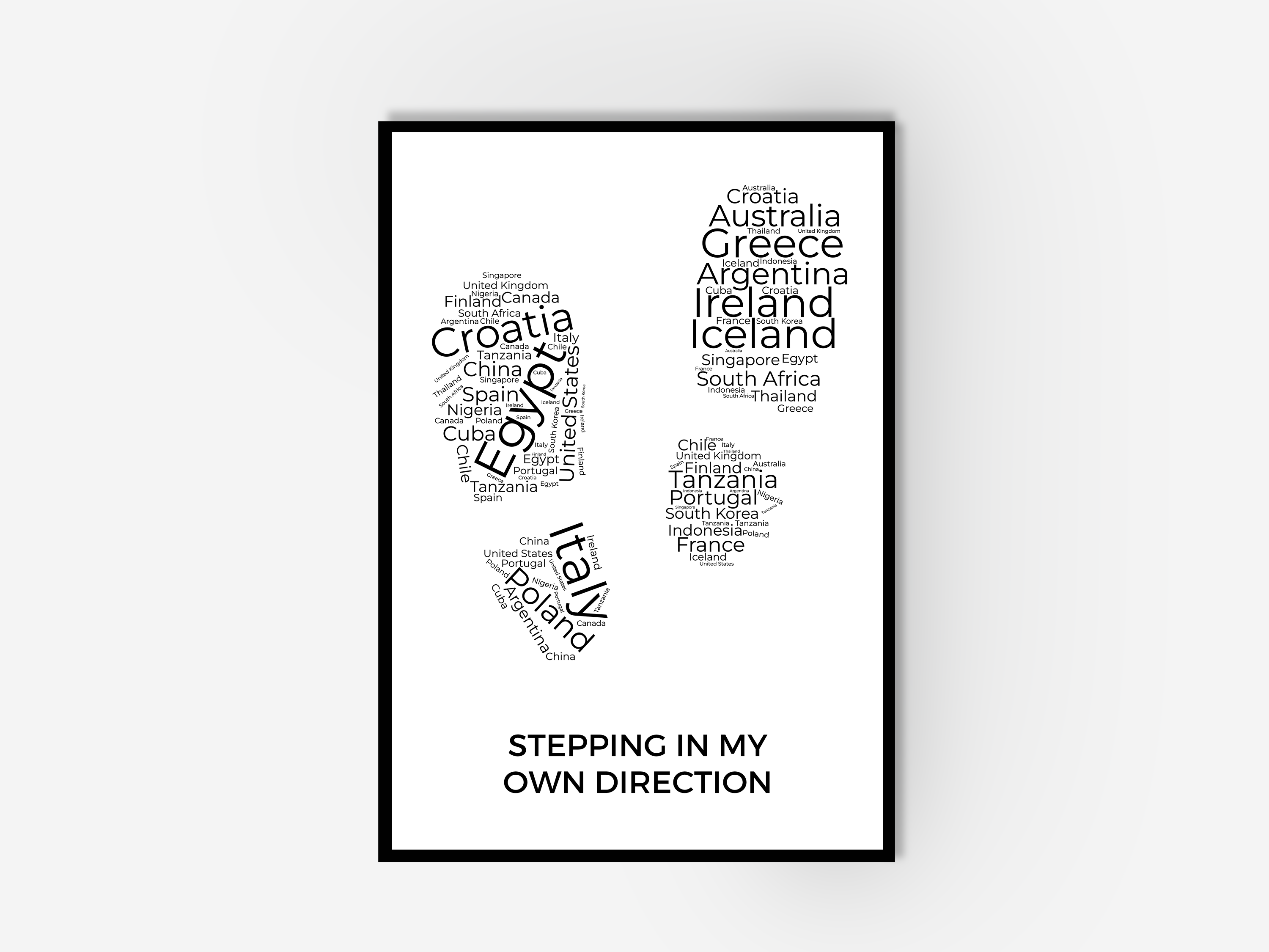 Unleash your inner wanderer and add a touch of artistic flair to your space with our destination travel poster. A stunning word collage shaped like shoe print outline featuring destinations from around the world. Perfect for travel lovers and adventurers. This personalised wall art could showcase your bucket list cities or countries you’ve already visited, whether that was backpacking, cycling or as part of a family road trip. This travel poster makes for a meaningful gift for yourself or fellow travellers. Ideal for home, office, or as a thoughtful travel gift, this artwork brings your journey to life on your walls.