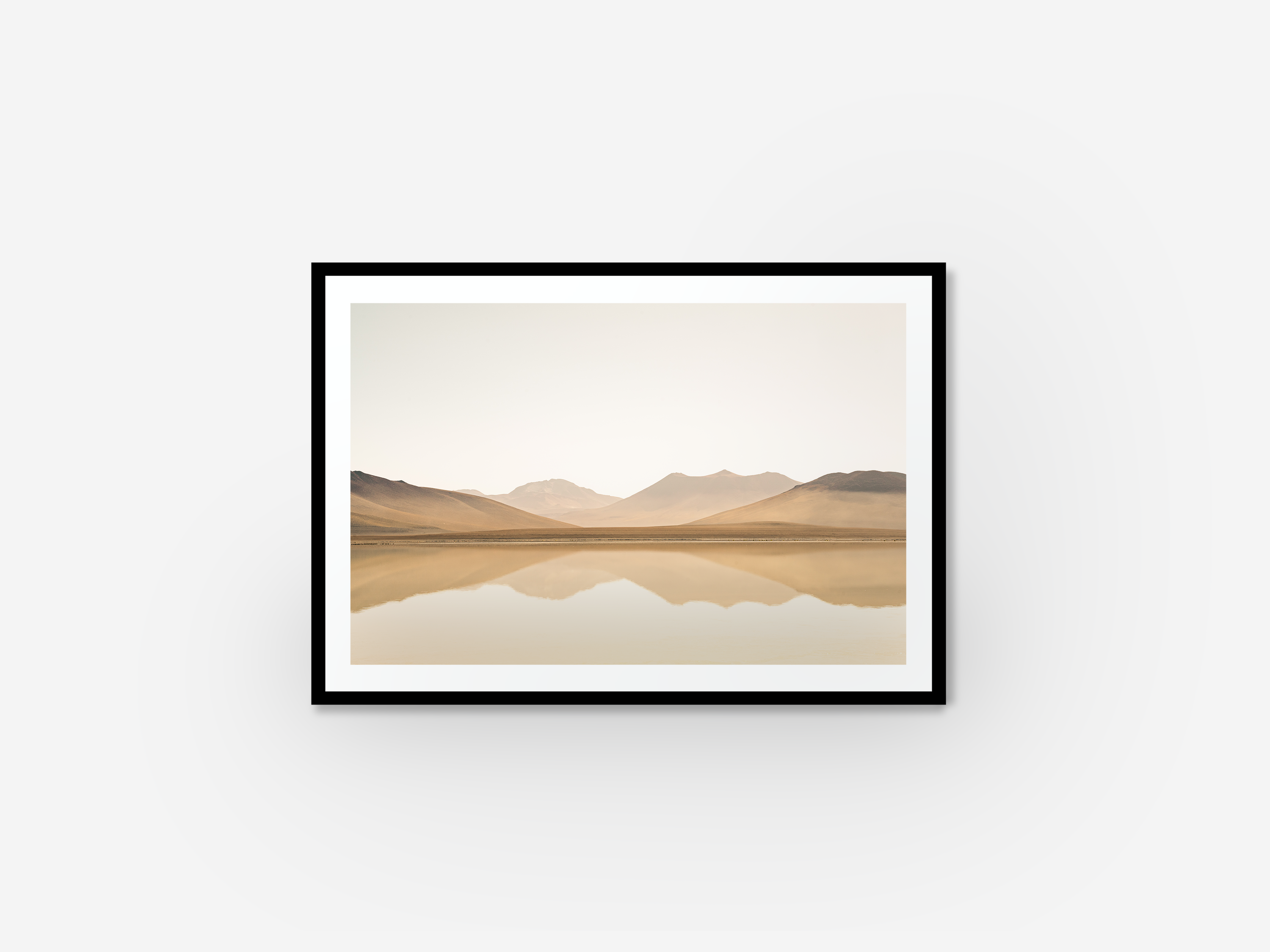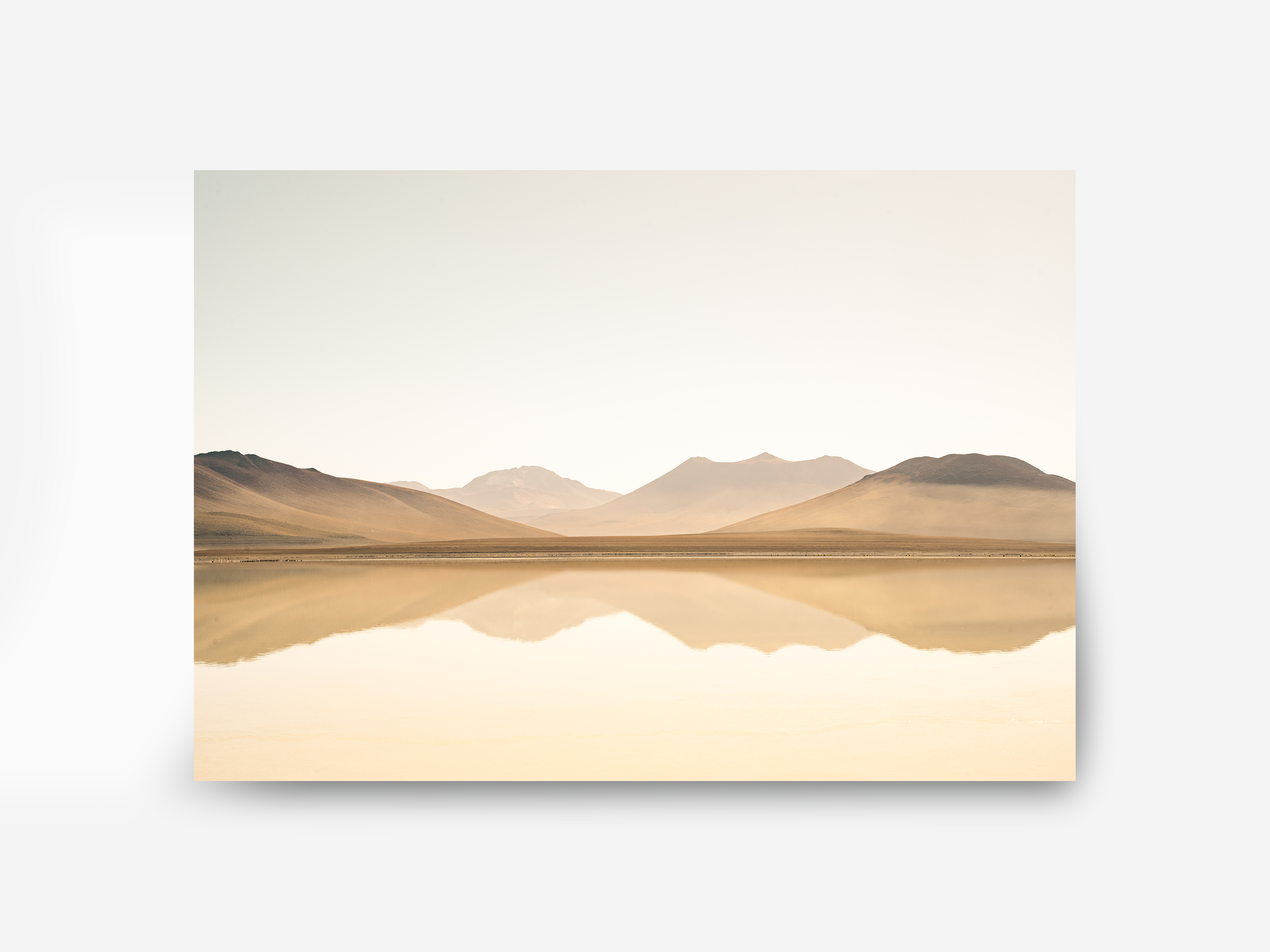 Experience the tranquil beauty of Bolivia’s rugged terrain with this captivating minimalist landscape print. This captivating photograph showcases a serene lake and a flawless mirror reflection of majestic brown mountains at sunrise. The composition’s simplicity and clarity embody the essence of minimalist photography, where negative space and natural symmetry create a peaceful and contemplative atmosphere.