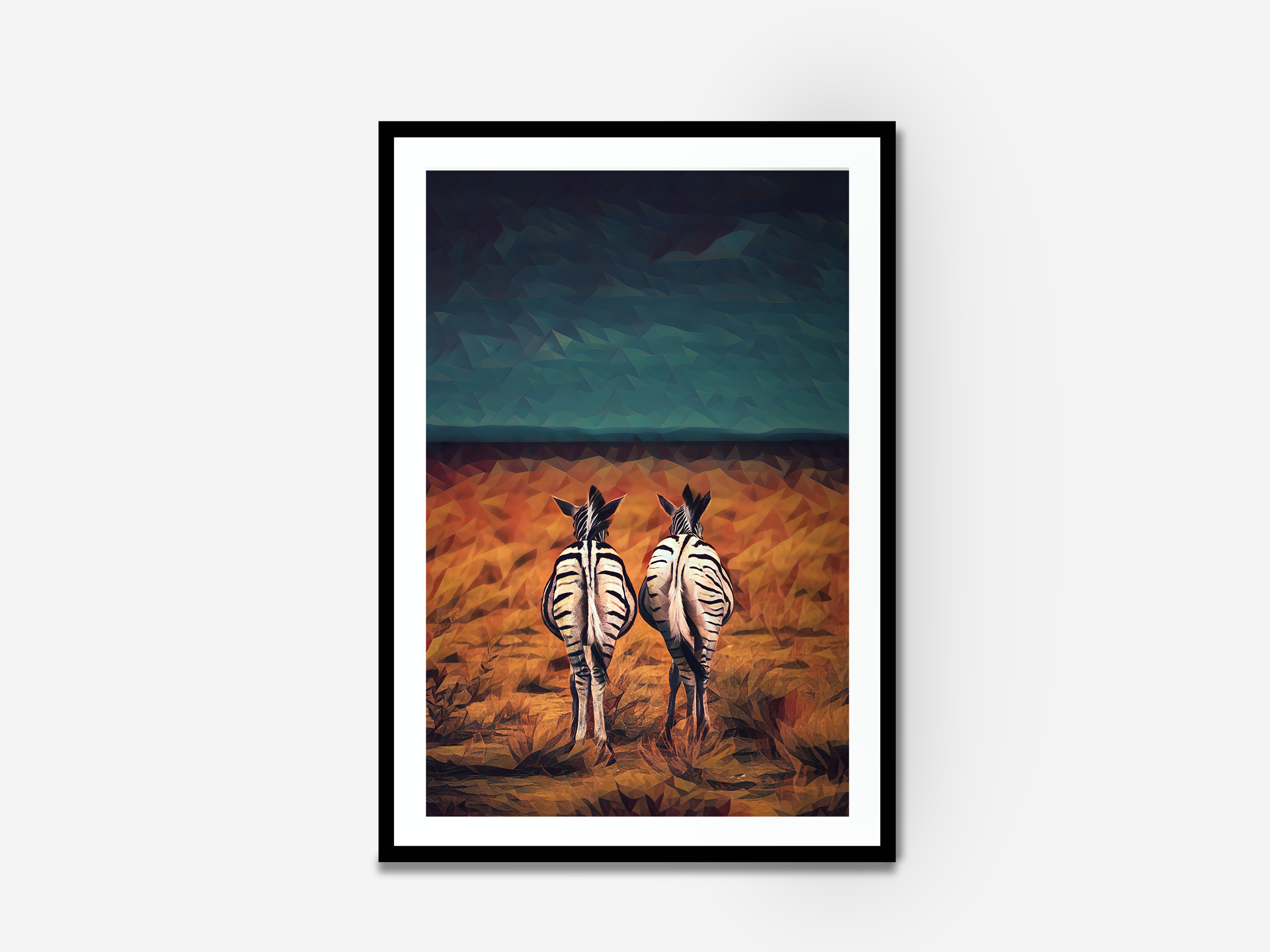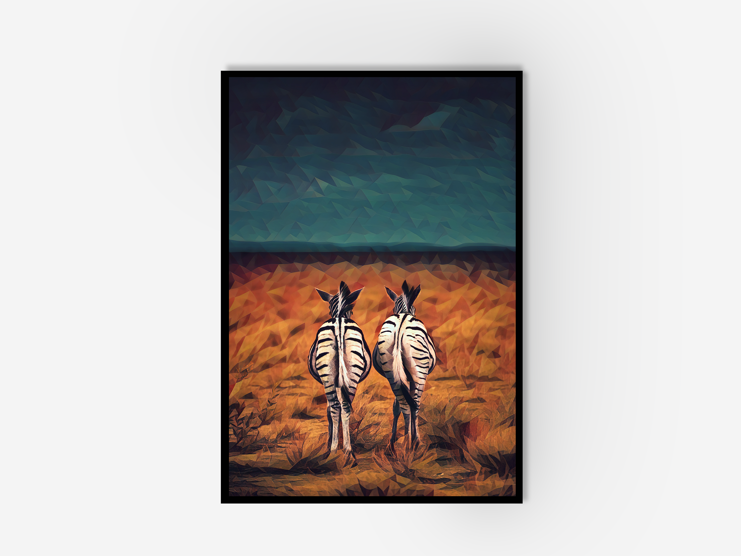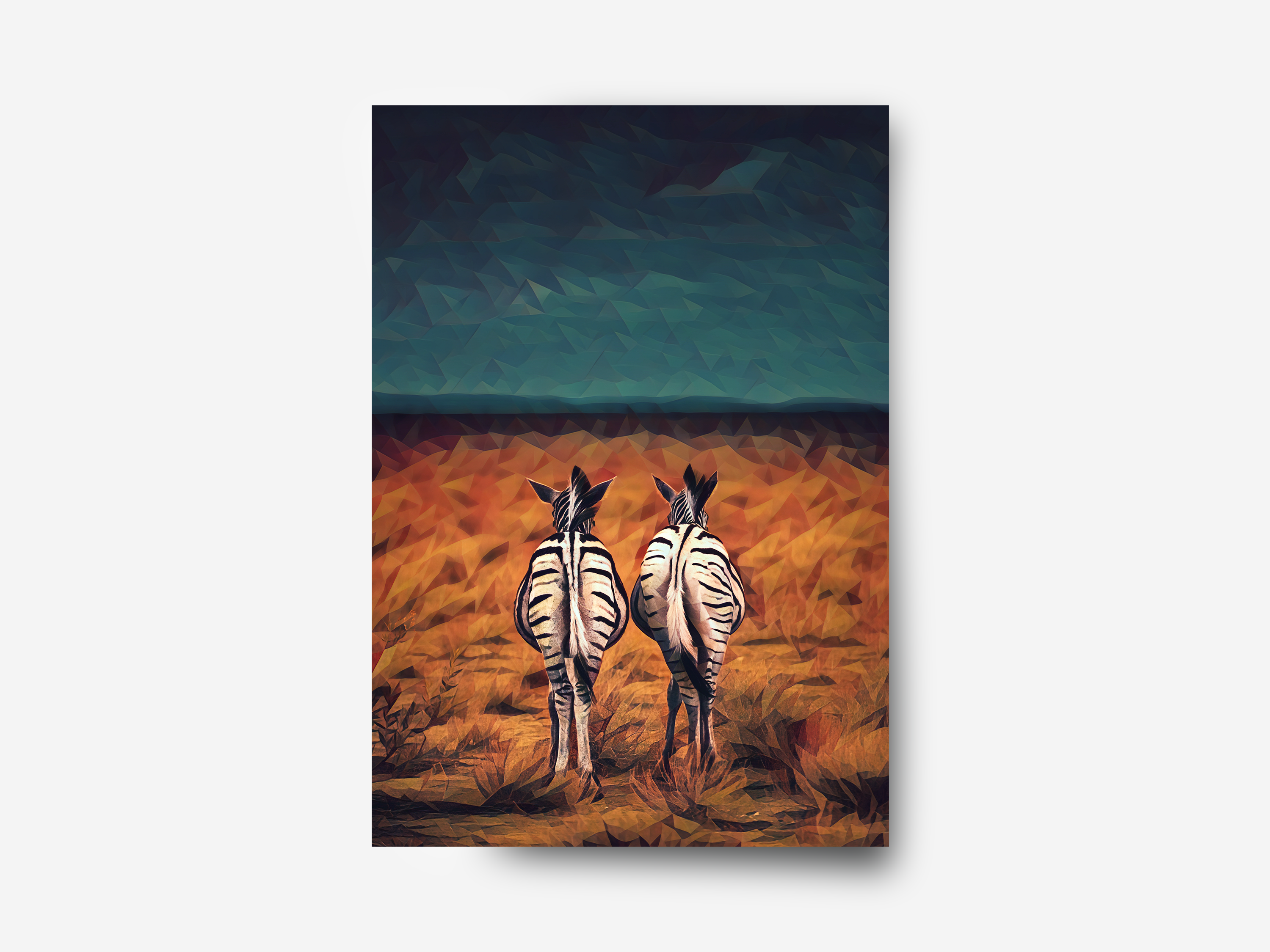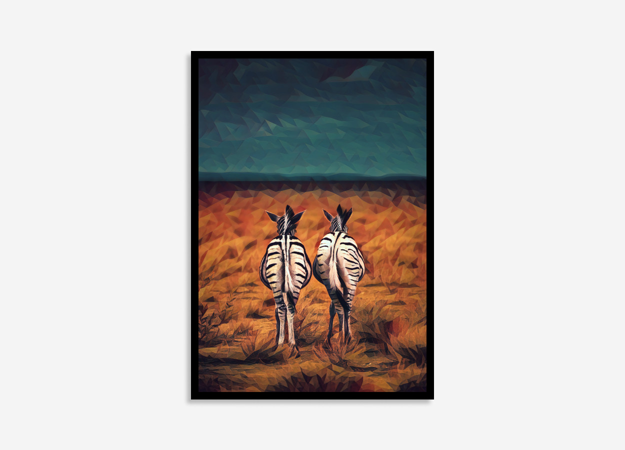 A geometric illustration print of Namibia. This wall art includes two zebras standing in a field in an African Safari Park. A great wildlife illustration.
